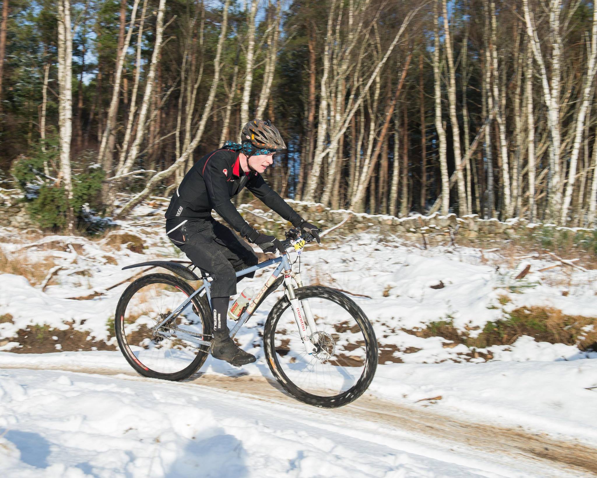 It quickly became a case of grinding away up the slippy fireroad in too hard a gear and then trying to make some time back on the singletrack. And repeat. It wasn’t long before I was regretting the gearing choice. The fireroad became painfully slow and sections of it had to be walked when it properly froze in the night. Ice tyres would have helped of course but I find it hard to justify the cost of them for one race a year! Before everything froze over though I noticed riders slipping around on the rocks in the singletrack with ice tyres on so I’m not sure how much of an advantage I would have gained over the course of the whole race. They certainly would have been useful however when I plummeted into the darkness down the icy rock slab in the middle of the night. After that fall I continued down the trail and across the bridge then started up the hill on the other side before I began to wonder why it seemed to be getting darker. Eventually, just before the switchback climb I stopped to check my light. Sure enough, the cable had been pulled out of the dynamo hub and my main front light had been gradually dimming. I was relieved at least that it wasn’t just shear exhaustion or that i’d hit my head and I was hallucinating.